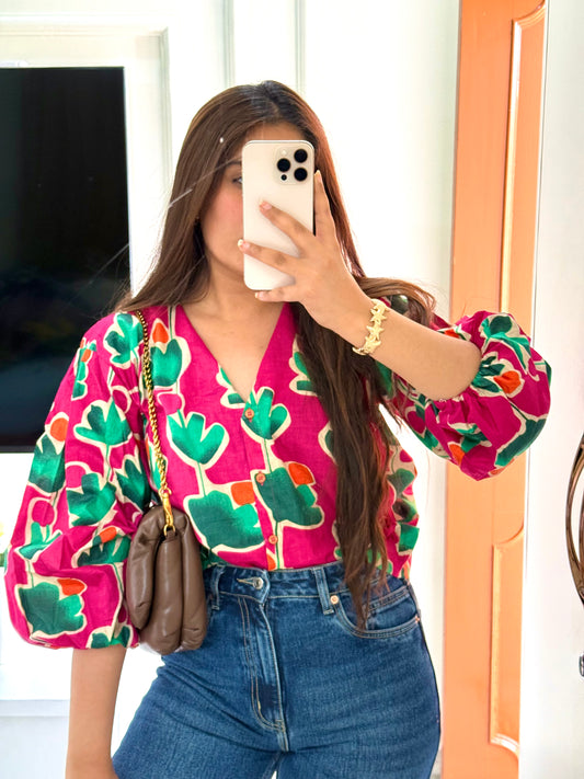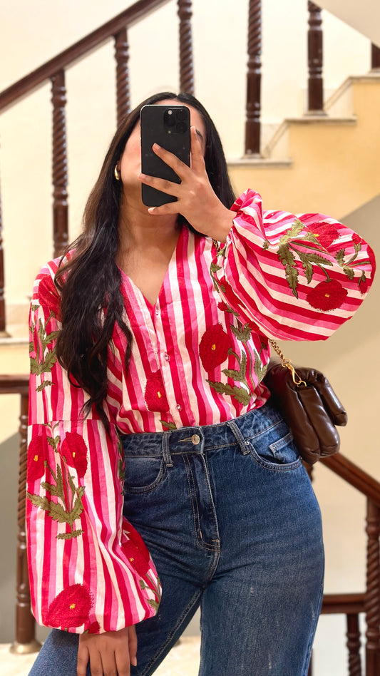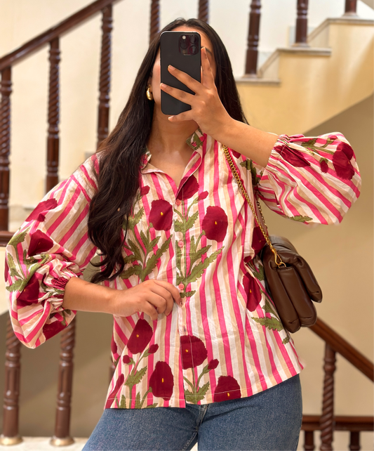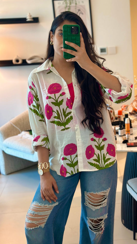 The POPPY print shirt is a vibe with its bold, bright florals, making you stand out effortlessly. It's comfy, stylish, and perfect for leveling up your wardrobe.